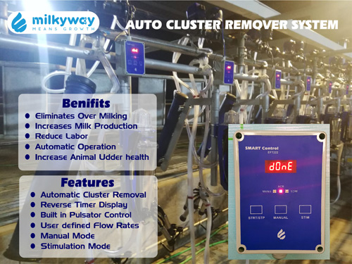 Every animal is automatically identified when it enters the milking parlor and assigned to the relevant MPC. From the start of the milking its state of art technology plays the role to get maximum output by stimulating the animal with the help of electronic pulsator with FCP. Throughout the milking it records milk quantity, flow rates and mastitis analysis is done. When our intelligent MPC observes the drop in flow rate after following the set protocol it triggers ACR System and therefore clusters are removed and all the recorded data is sent to Milkyway Online Software via Internet. Owner can access complete data from any smart device anywhere on the globe on real time basis.